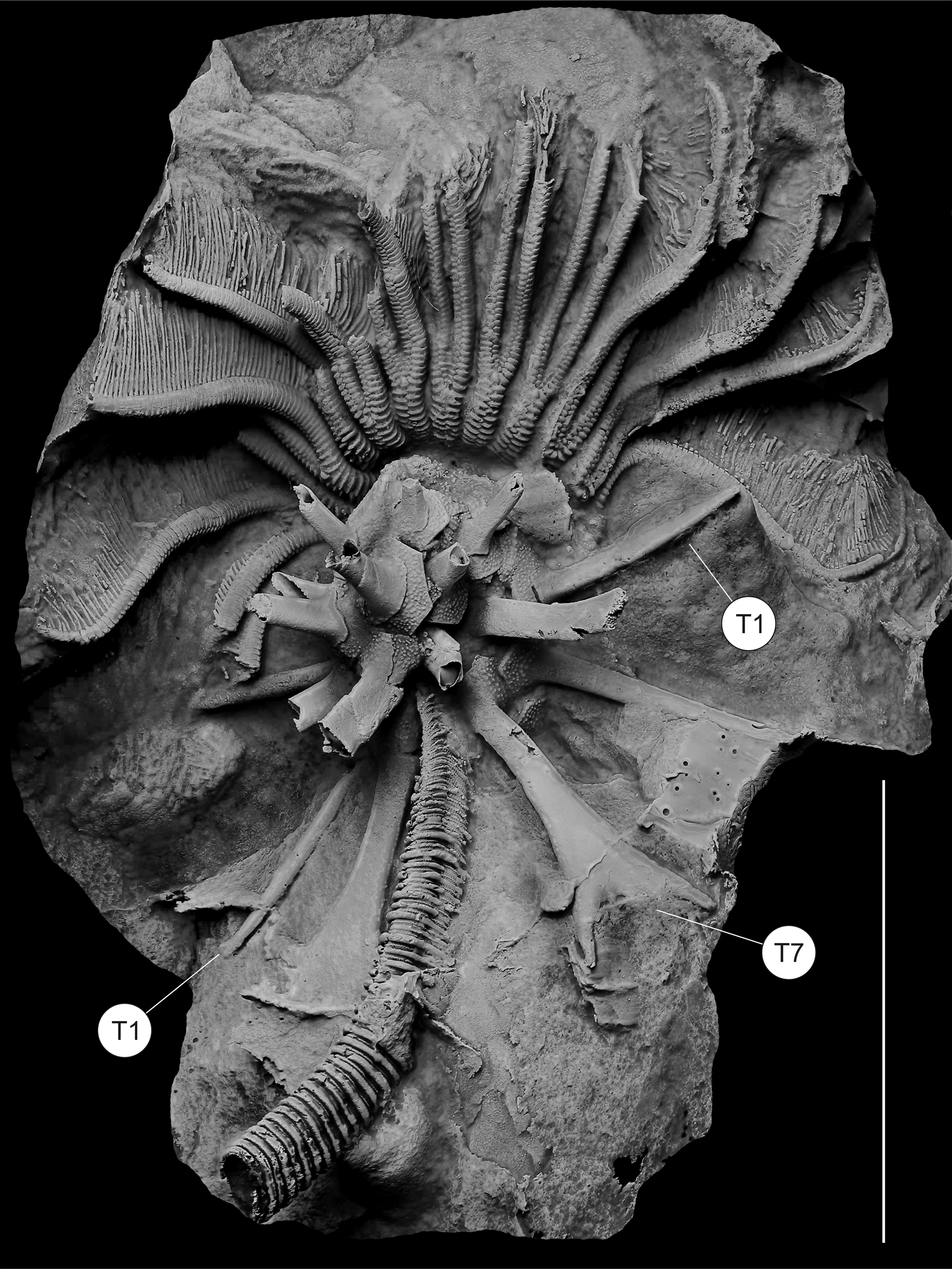 Figure 10. Lateral view of the cast of the most complete known Monstrocrinus (no. NHMMZ PWL 2021/6145-LS), M. granosus Schmidt, Reference Schmidt1941, from the uppermost section of the Emsian Orthocrinus Beds (Polygnathus costatus patulus Conodont Biozone) of the former brick factory in the Osterbachtal, northwest of Olpe-Lütringhausen (administrative district Arnsberg, Sauerland, North Rhine–Westphalia, Germany). The specimen in matrix shows a longer part of stem, partly articulated spines, especially spine types 1 and 7 (T1 and T7), which are well preserved, and brachials preserved. The specimen shows evidence of non-lethal predation of its arms in which the distal portions are narrower than the proximal arms. Similarly, in two rays on the right portion of the organism, the free arm bifurcation is lower than in other arms, and the arms above the bifurcation are narrower. Scale bar = 3 cm.