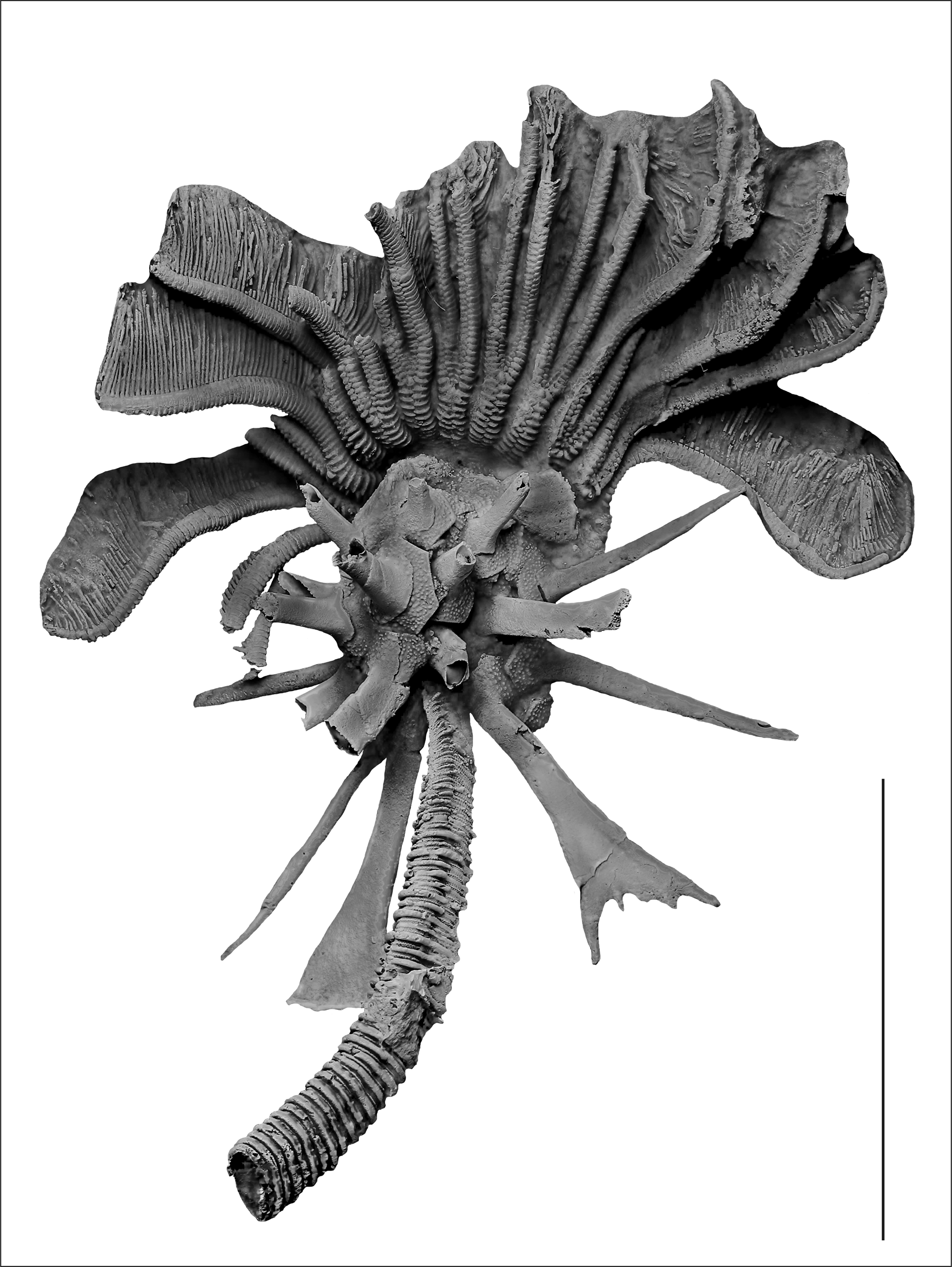 Supraregionally, Monstrocrinus is the youngest representative of the three genera mentioned with occurrences extending into the middle to upper Eifelian in Brazil, where the genus has the youngest known stratigraphic occurrence (Scheffler et al., Reference Scheffler, Fernandes and Da Fonseca2006, Reference Scheffler, Dias-Da-Silva, Gama, Da Fonseca and Fernandes2011). Monstrocrinus is an enigmatic crinoid with long, elaborate spines attached to numerous calyx plates. Most preserved remains of this crinoid are isolated spines; thus, spine morphology has largely been the basis for species differentiation. Also, because neither an associated column nor a preserved external view of the infrabasal circlet were known previously, a free-living benthic lifestyle was proposed for this unusual crinoid (e.g., Schmidt, Reference Schmidt1941; Ettensohn, Reference Ettensohn1984). The new partially articulated specimens reported here with variable spine shapes on a single individual and an attached column allow a reassessment of Monstrocrinus systematics and paleoecology.