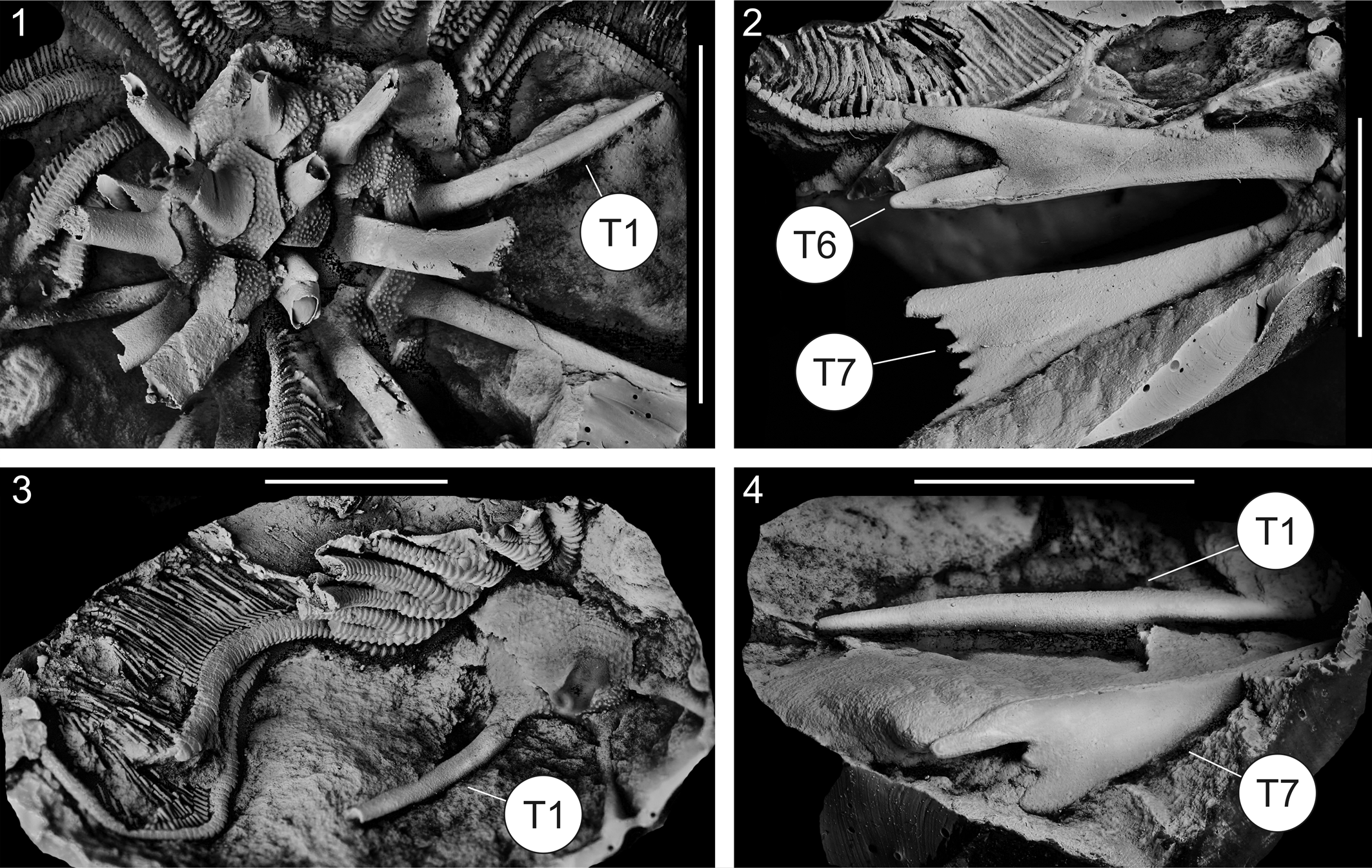 Figure 12. (1–4) Detail views of the specimen from Figures 10 and 11. (1) Lateral view of the spined calyx with well-preserved spine type 1 (T1). (2–4) Casts of the counter plates: (2) lateral view of two well-preserved spines of types 6 and 7 (T6, T7); (3) lateral view of part of the arms and calyx, showing spine type 1 (T1); (4) lateral view of spine types 1 and 7 (T1, T7). Scale bars = 2 cm in (1) and 1 cm in (2–4).
