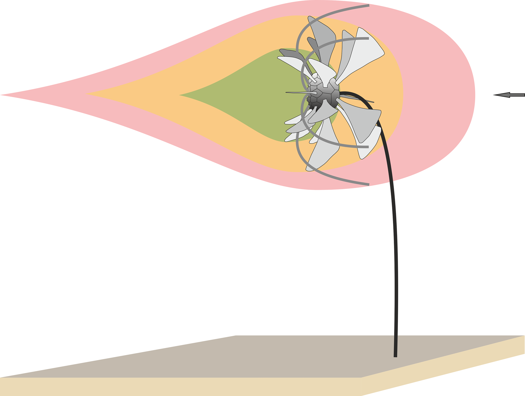 Figure 13. Schematic reconstruction of Monstrocrinus in feeding posture (based on the model of Pterotocrinus depressus by Baumiller and Plotnick, Reference Baumiller and Plotnick1989, p. 323, fig. 10); note arms are not in this reconstruction. The arrow indicates the current direction. In this model, the spines of Monstrocrinus serve as stabilizing fins or rudders, allowing the passive maintenance of an efficient feeding posture in moving water. While the crown is lifted into the water column by the stem and the arms were stretched out in the filtration fan feeding position, an aboral-to-oral water flow through the spines create a zone of slower recirculating water downstream toward the arms and the oral side of the calyx. The zone shown in pink, yellow, and green indicate fast, medium, and slower recirculating water downstream.