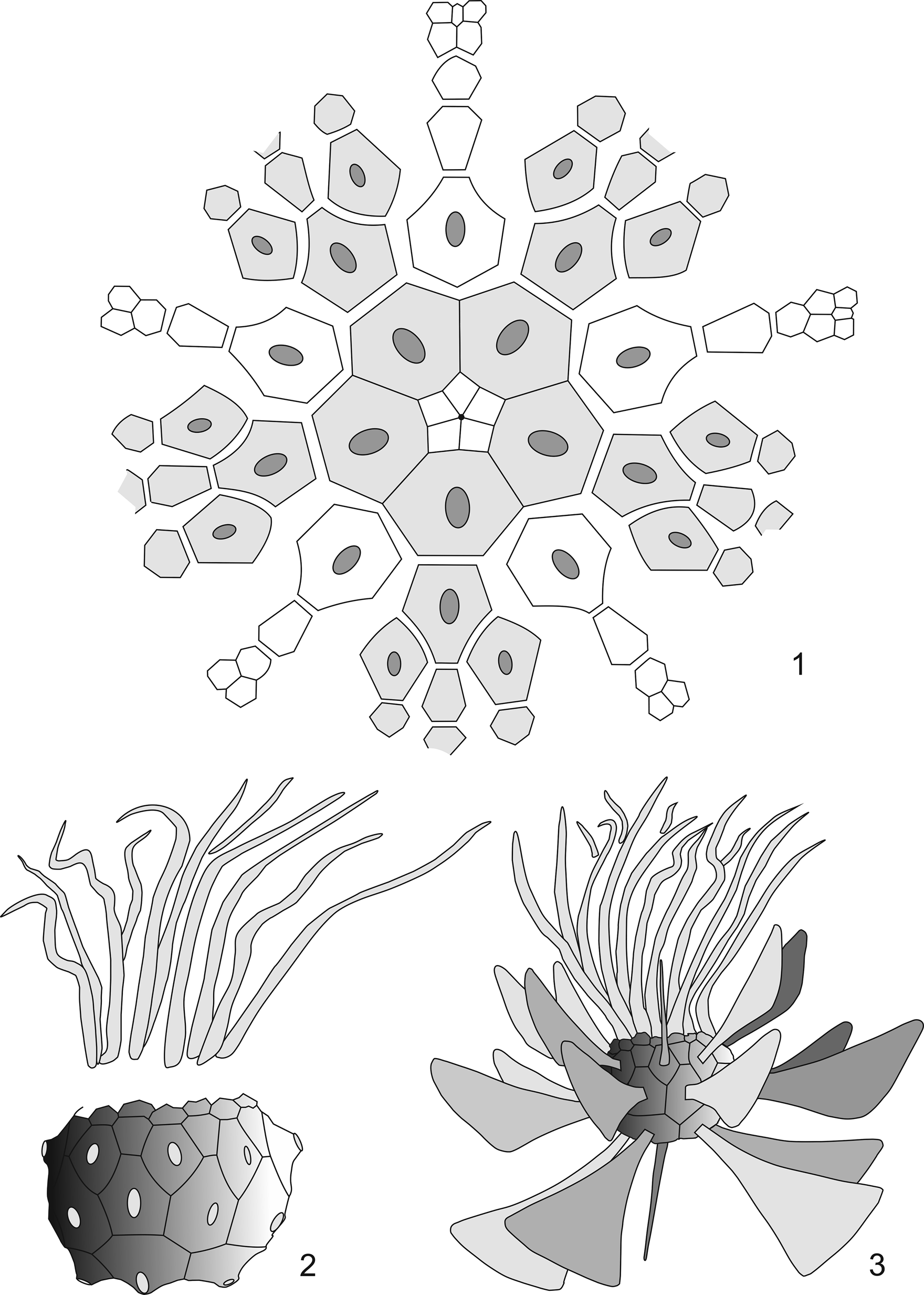 Figure 2. (1) Calyx plate diagram of Monstrocrinus securifer according to Schmidt (Reference Schmidt1941, p. 214, Fig. 60a). (2) Schematic reconstruction drawing of a Monstrocrinus calyx with “broken off floating spines” and “indicated arms” after Schmidt (Reference Schmidt1941, p. 214, Fig. 60b). (3) Reconstruction drawing of Monstrocrinus securifer, previously interpreted as a stemless crinoid, with “completely preserved floating spines” (after Schmidt, Reference Schmidt1941, p. 214, Fig. 60b); arms are simplified.