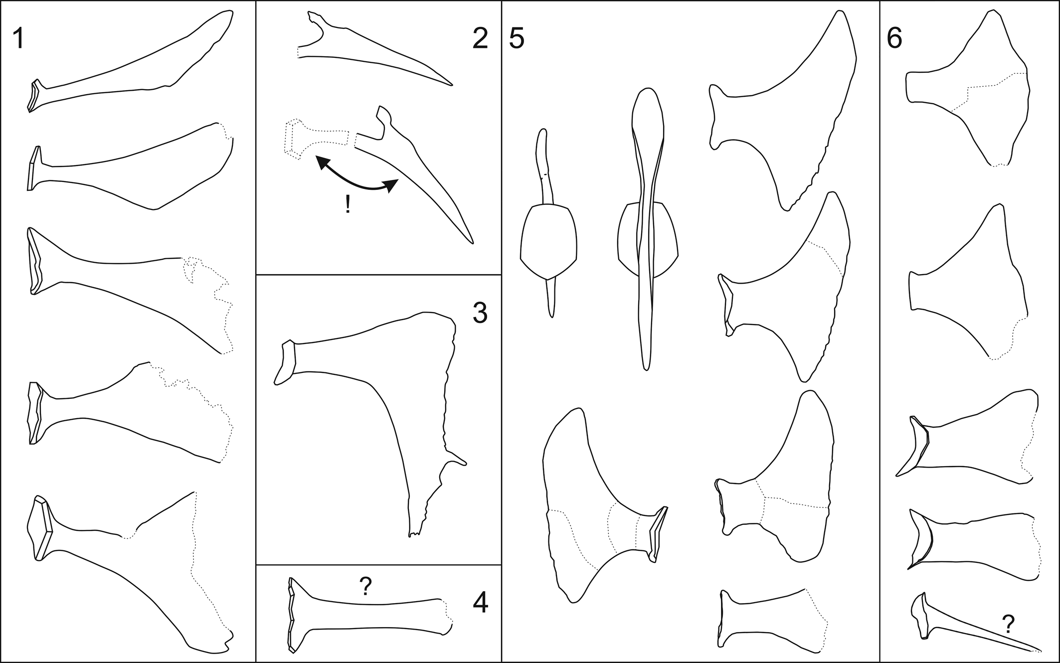 Figure 3. The isolated spiny calyx plate appendages of genus Monstrocrinus depicted in the literature. (1) Monstrocrinus securifer (after Schmidt, Reference Schmidt1941, pl. 16). (2) Monstrocrinus granosus (after Schmidt, Reference Schmidt1941, p. 217, fig. 61, no. b2), the upper figure shows a disarticulated distally forking spiny calyx plate appendage. Le Menn (Reference Le Menn1990, p. 156, fig. 3b) wrongly interpreted the prong-shaped extension as pointing proximally toward the calyx plate (see lower figure); however, the prong-shaped extension is not a backward-pointing prong, but a distally tapering bifurcation (see Schmidt, Reference Schmidt1941, p. 217). (3) “Monstrocrinus aliformis” (after Le Menn, Reference Le Menn1990, p. 152, fig. 1b). The species is interpreted in the present work as a subjective younger synonym of M. securifer. (4) “Monstrocrinus sp.” according to Le Menn (Reference Le Menn1990, p. 152, fig. 1d; 1997, pl. IV, fig. 14). The plate fragment cannot be clearly assigned to the genus Monstrocrinus. (5) Monstrocrinus incognitus (after Scheffler et al., Reference Scheffler, Dias-Da-Silva, Gama, Da Fonseca and Fernandes2011, p. 1191–1192, figs. 3, 4.1–4.6). (6) “Monstrocrinus securifer” (after Scheffler et al., Reference Scheffler, Fernandes and Da Fonseca2006, p. 238, fig. 3A–3E), either belonging to M. incognitus or to another species (further investigations are needed). The isolated spine shown at the bottom of the figure cannot be unequivocally assigned to the genus Monstrocrinus.
