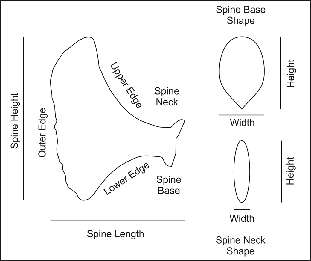Type 2: blunt spine.—Entire spine higher than wide, elliptical in cross section; upper and lower edges either slightly expanding, parallel, or slightly narrowing; tapers to a flat, blunt terminus (Fig. 9.2).