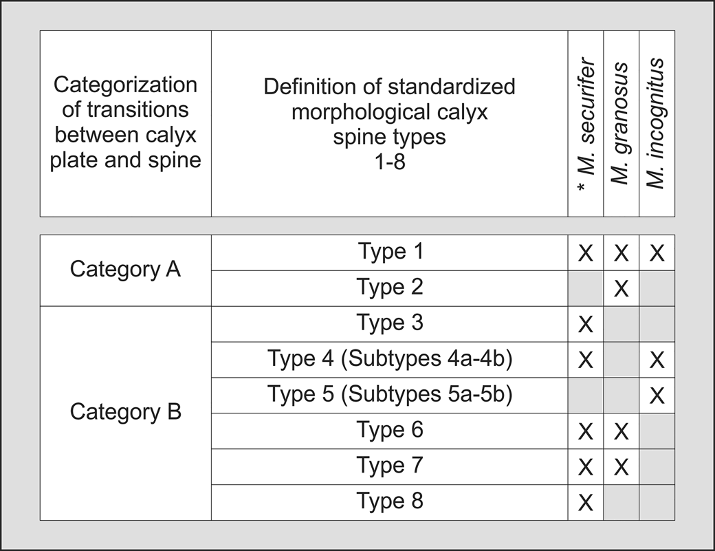 Figure 5. Categorization of transitions between calyx plate and spine and definition of standardized morphological calyx spine types and subtypes.