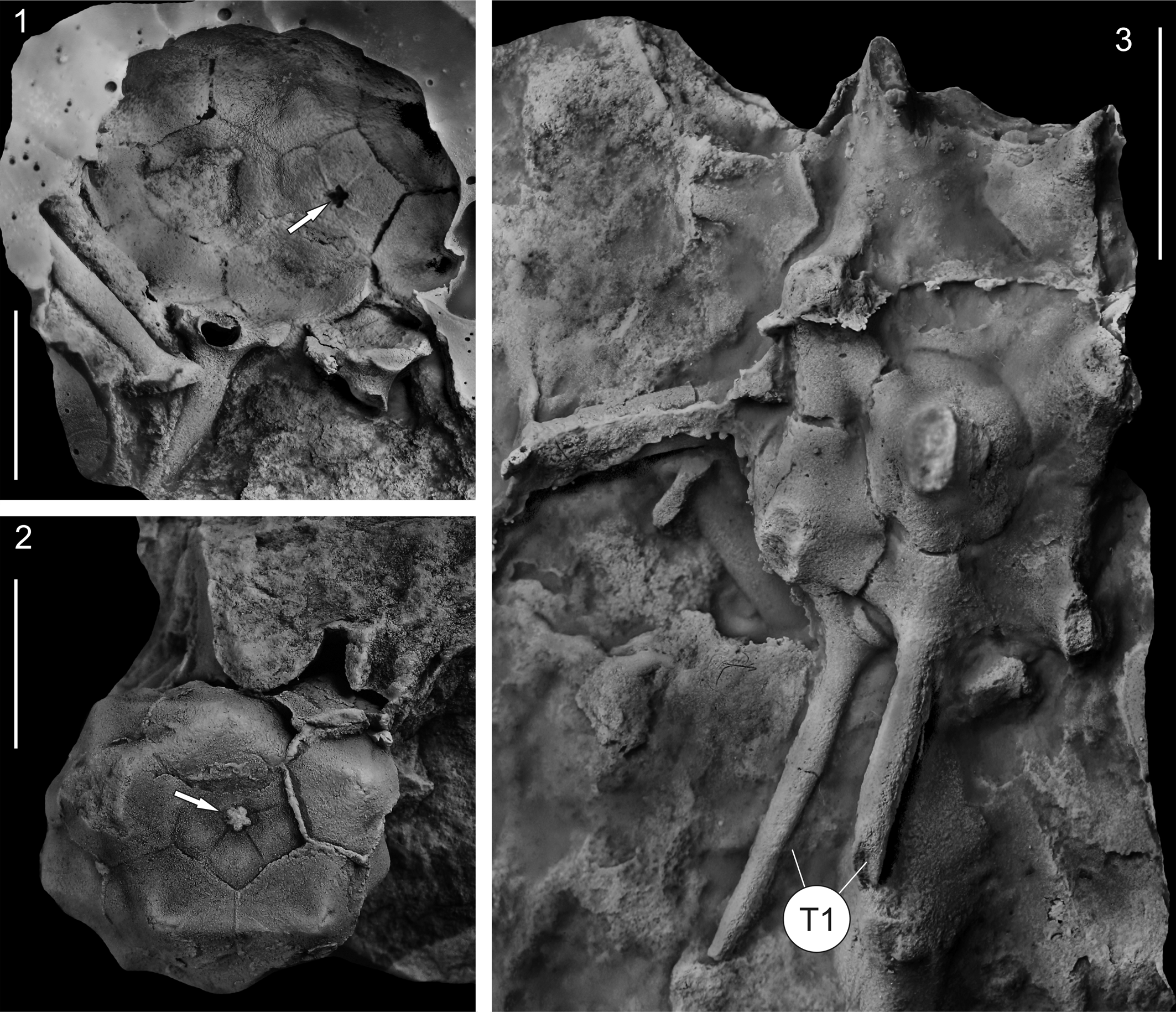 Figure 6. Recast holotype of Monstrocrinus securifer Schmidt, Reference Schmidt1941 (no. IGPB-SCHMIDT, W.E.-18a) from the uppermost section of the Emsian Orthocrinus Beds (Polygnathus costatus patulus Conodont Biozone) of the former brick factory in the Osterbachtal, northwest of Olpe-Lütringhausen (administrative district Arnsberg, Sauerland, North Rhine–Westphalia, Germany). (1, 2) Aboral view of the calyx, showing pentalobate axial canal (white arrows), which were not shown in the original illustration by Schmidt (Reference Schmidt1941, pl. 16, fig. 2b); (3) lateral view of the calyx with rudimentarily preserved type 1 spines (white T1). Scale bars = 1 cm.