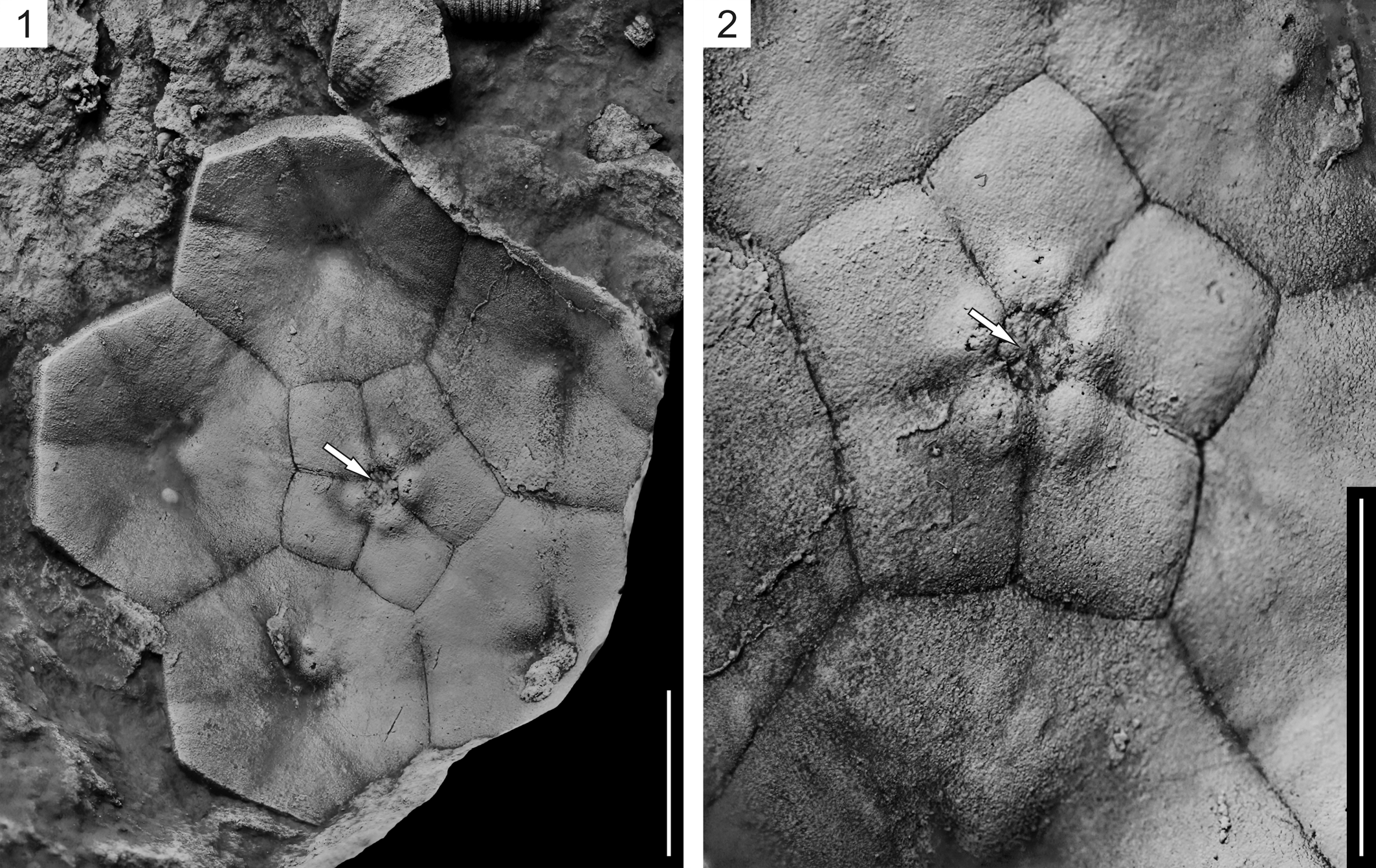 Figure 7. Recast paratype of Monstrocrinus securifer Schmidt, Reference Schmidt1941 (no IGPB-SCHMIDT, W.E.-18c) from the uppermost section of the Emsian Orthocrinus Beds (Polygnathus costatus patulus Conodont Biozone) of the former brick factory in the Osterbachtal, northwest of Olpe-Lütringhausen (administrative district Arnsberg, Sauerland, North Rhine–Westphalia, Germany). (1, 2) Internal aboral view of isolated base of a calyx, showing narrow stem axial canal impression (white arrows), which Schmidt mistakenly interpreted as closed (see Schmidt, Reference Schmidt1941, pl. 16, fig. 3). Scale bars = 1 cm.