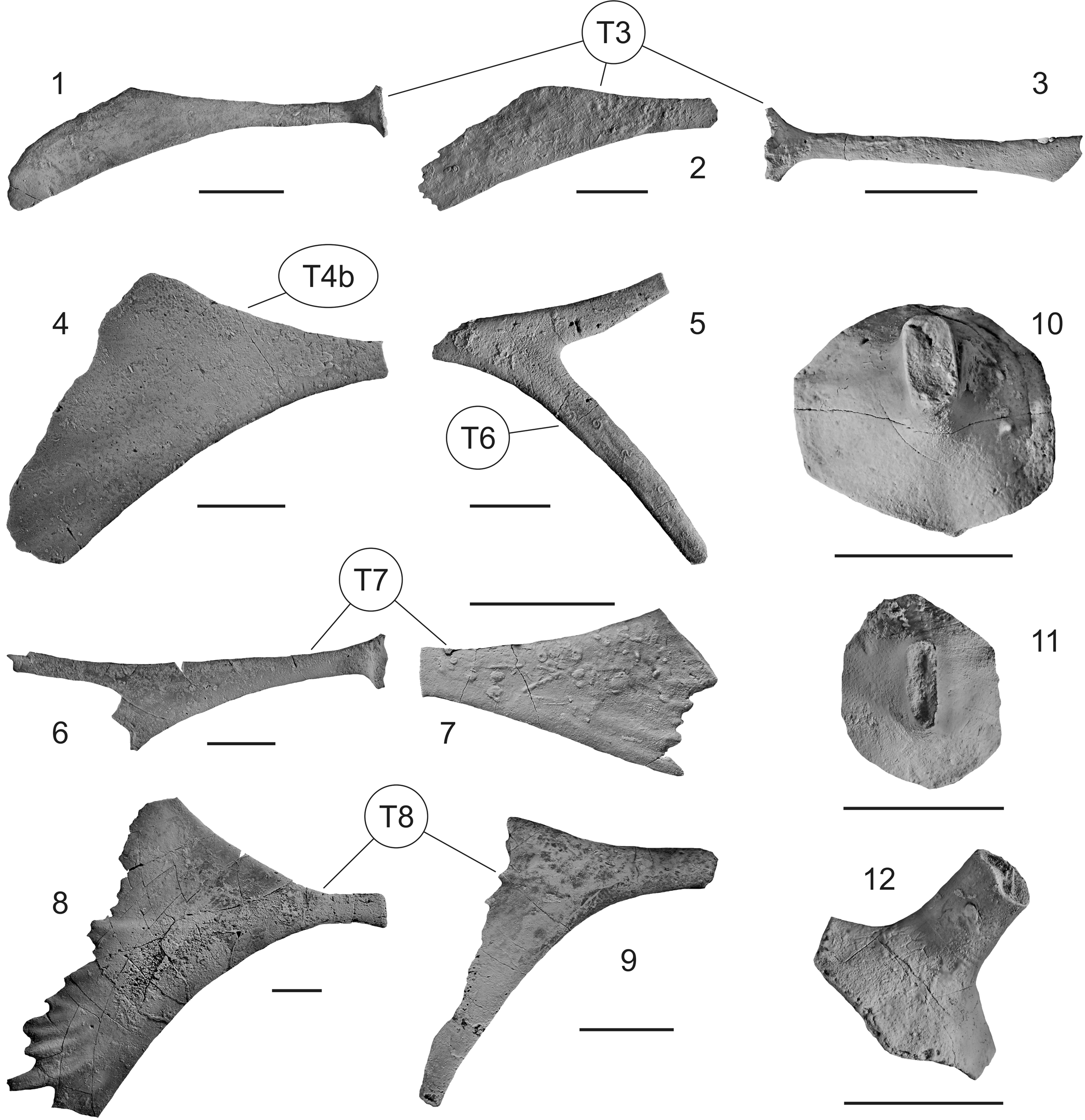 Figure 8. Calcite-preserved spines (1–9) and isolated calyx plates (10–12) of Monstrocrinus securifer Schmidt, Reference Schmidt1941, from the Lauch Formation (Polygnathus costatus partitus to lowermost P. costatus costatus Conodont biozones) of the lower Eifelian of the Eifel synclines, Germany; (1, 4–12) are from the “Eschfelder Seifen,” southeast of Dollendorf, north-northwest of Leudersdorf, North Rhine–Westphalia; (2, 3) are from the northern Ahbach Valley, north-northeast of Üxheim–Ahütte, Rhineland–Palatine). (1–3) Type 3 spines (T3); (4) subtype 4b spine (T4b); (5) type 6 spine (T6); (6, 7) type 7 spines (T7); (8, 9) type 8 spines (T8); (10, 11) isolated calyx plates with “Category B” transitions between the proximally positioned calyx plates and the distally projecting end of the spines (“secondary spines,” not preserved). The spine attachment shows eight-shaped concavities. Scale bars = 1 cm.