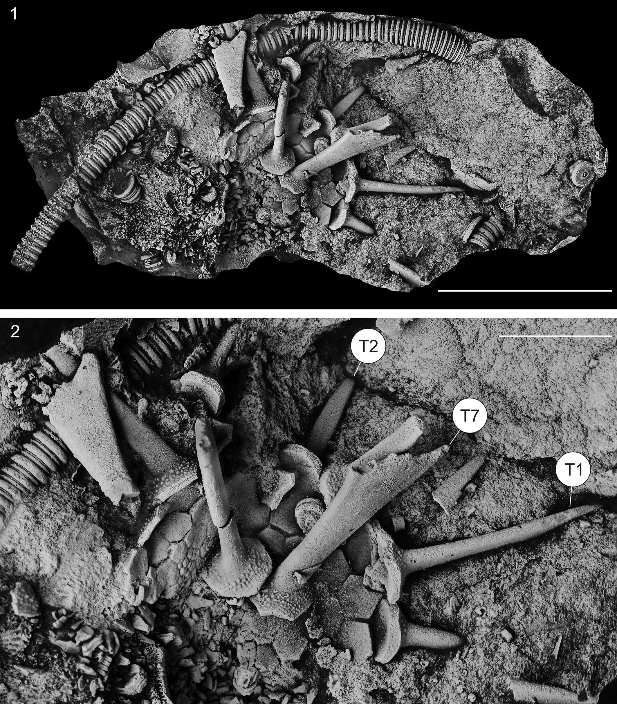 Figure 9. Recast holotype of Monstrocrinus granosus Schmidt, Reference Schmidt1941 (no. SMF XXIII 113a) from the upper Emsian Mandeln Formation (Polygnathus serotinus Conodont Biozone) of Dietzhölztal–Mandeln in the Lahn–Dill district in central Hesse, north-northeast of Dillenburg. (1) Strongly disarticulated crown with longer part stem in matrix (until the present study, the stem was not interpreted as belonging to the individual); (2) detailed view, showing remains of spine types 1, 2, and 7 (T1, T2, T7) and granulated calyx plates. Scale bars = 3 cm in (1) and 1 cm in (2).