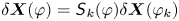 \begin{align} \Delta \mathcal{L}_{\bar{\boldsymbol{X}}} &= \Delta \bar{\boldsymbol{X}}_k + \int_{2{\rm \pi} k/n_0}^{2{\rm \pi} (k+L)/n_0} \Delta \boldsymbol{X} \boldsymbol{\cdot} \left( -\frac{\textrm{d}\boldsymbol{\mu}_{\boldsymbol{X}_k}}{\textrm{d}\varphi} - \boldsymbol{\nabla}_{\boldsymbol X} \boldsymbol{V} \boldsymbol{\cdot} \boldsymbol{\mu}_{\bar{\boldsymbol{X}}_k} \right) \,\textrm{d}\varphi\nonumber\\ &\quad + \Delta \boldsymbol{X} \left( 2{\rm \pi} (k+L)/n_0 \right) \boldsymbol{\cdot} \boldsymbol{\mu}_{\bar{\boldsymbol{X}}_k} \left( 2{\rm \pi} (k+L)/n_0 \right)\notag\\ &\quad - \Delta \boldsymbol{X} \left( 2{\rm \pi} k / n_0 \right) \boldsymbol{\cdot} \boldsymbol{\mu}_{\bar{\boldsymbol{X}}_k} \left( 2{\rm \pi} k / n_0 ) \right) \text{.} \end{align}
