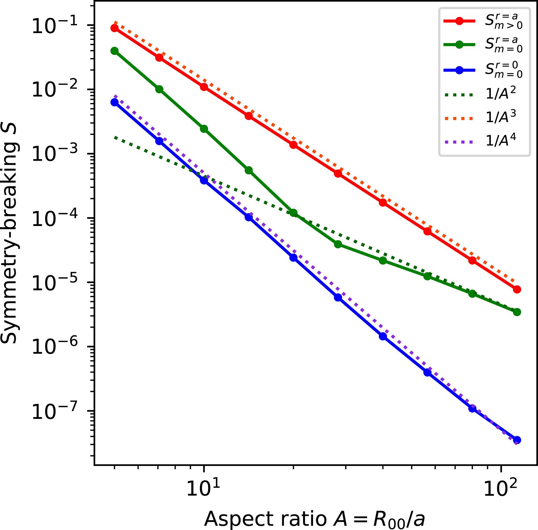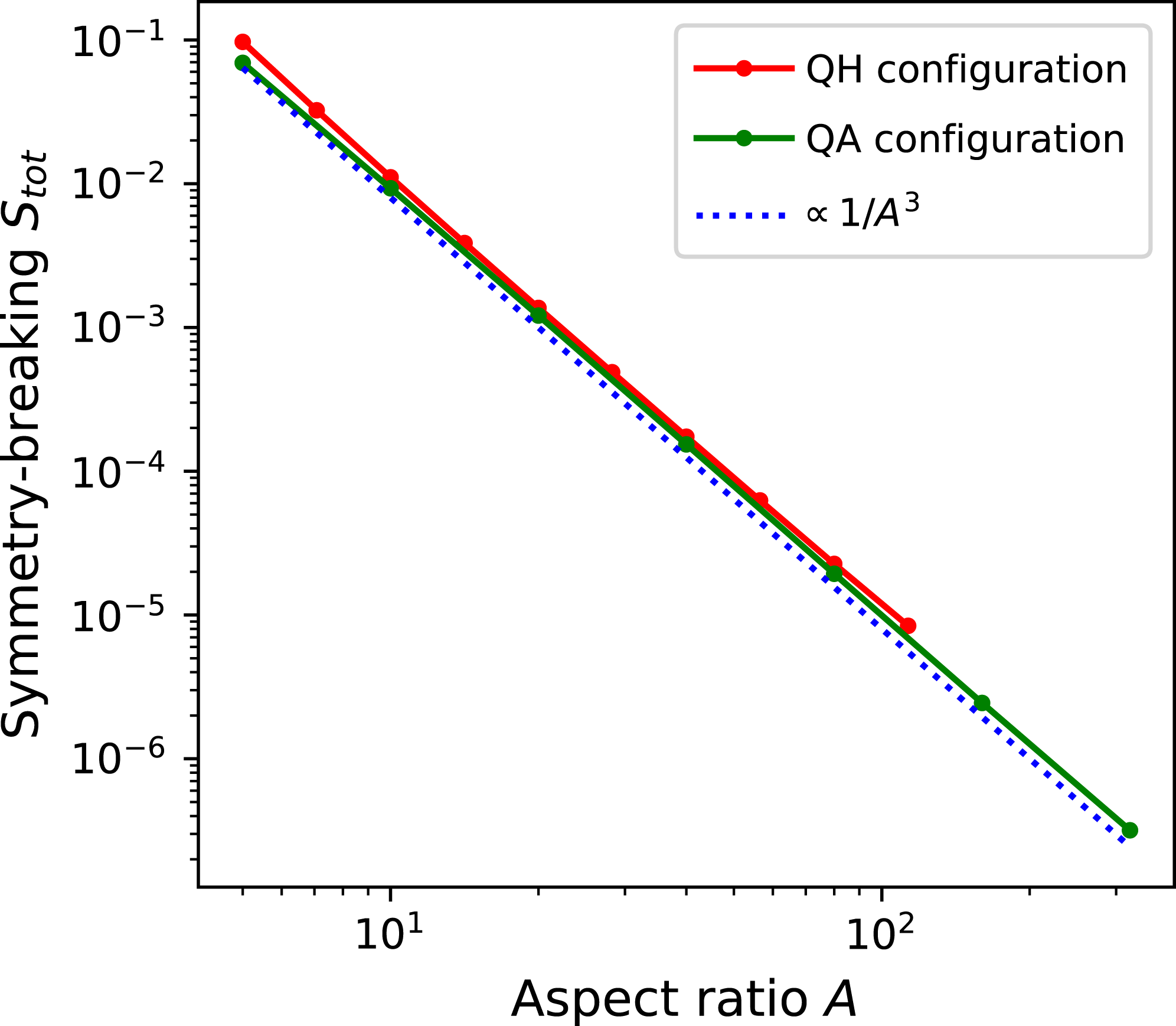 In Garren and Boozer’s original work, it was argued quasisymmetry can be achieved (in the absence of axisymmetry) to $O((r/{\mathcal{R}})^{2})$ but not to $O((r/{\mathcal{R}})^{3})$ , so departures from quasisymmetry should scale as the cube of the inverse aspect ratio. However, despite various numerical calculations of quasisymmetric configurations using optimization since 1991, there does not appear to have been a numerical demonstration of this predicted scaling. Using the construction here we are able to numerically demonstrate this predicted ideal scaling for the first time (figure 8). An implication of this scaling is that quasisymmetry can be achieved to arbitrary precision, in the following sense. Given any desired small level of symmetry-breaking Fourier modes in $B$ , and given any desired axis shape (constrained only by the requirement that its curvature cannot vanish), there is some aspect ratio above which quasisymmetry can be achieved to the desired precision. To emphasize this point, we will present examples of non-axisymmetric configurations in which quasisymmetry is realized to unprecedented precision, with the symmetry-breaking mode amplitudes orders of magnitude smaller than in previously reported configurations.