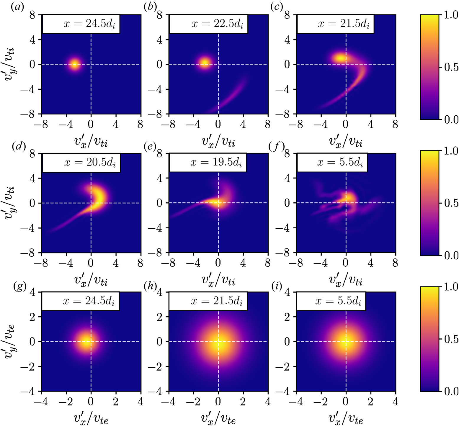 Figure 2. The ion (panels (a)–(f)) and electron (panels (g)–(i)) distribution functions in the simulation frame (downstream frame) $f_s(x, v_x', v_y')$