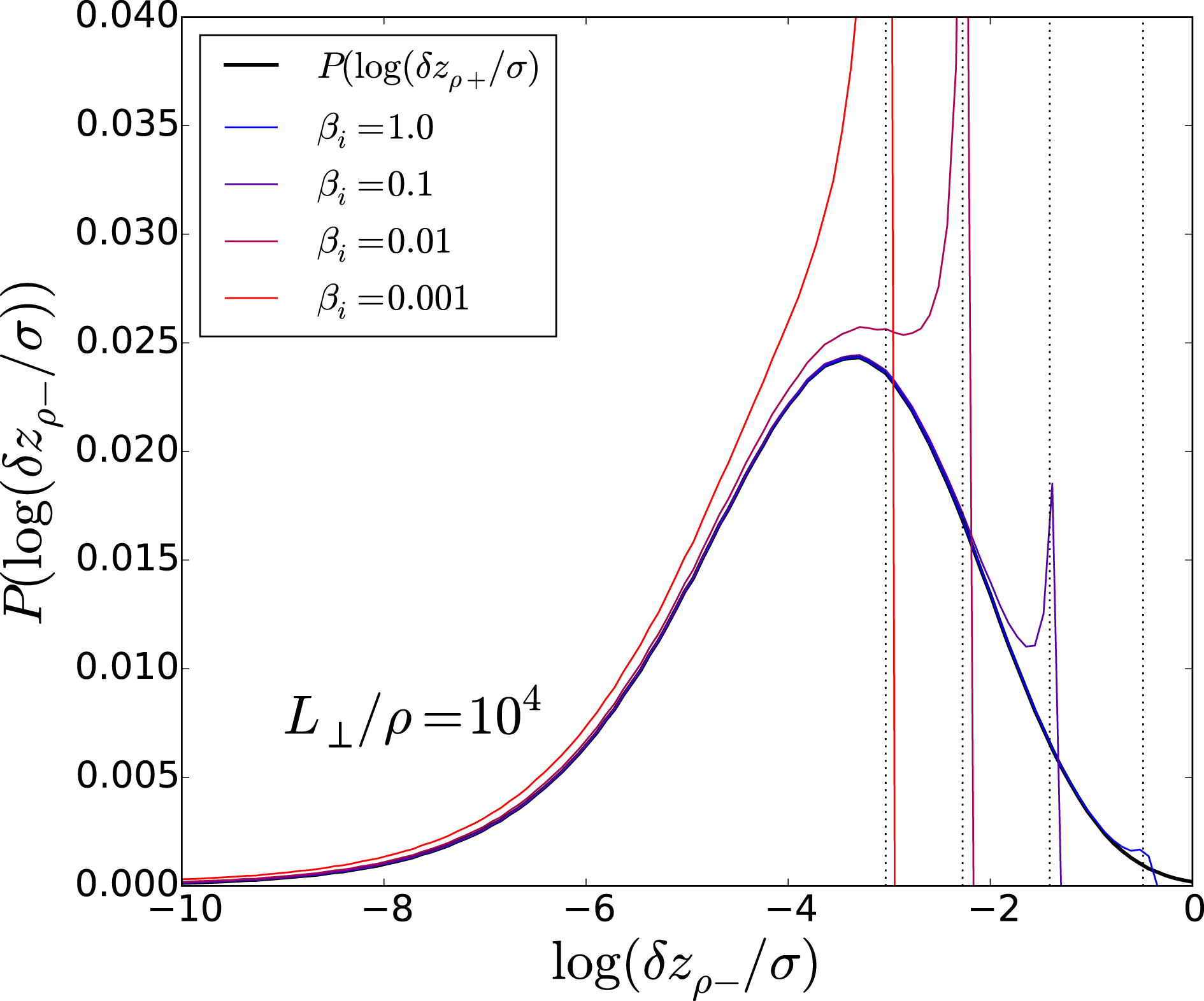 are the perpendicular velocity and magnetic-field (in velocity units) fluctuations respectively. There are a number of different intermittency models (Müller & Biskamp Reference Müller and Biskamp2000; Chandran, Schekochihin & Mallet Reference Chandran, Schekochihin and Mallet2015) available; here, we will use the MS17 (Mallet & Schekochihin Reference Mallet and Schekochihin2017) model, but our results do not depend in detail on this choice.Footnote