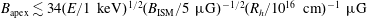 $B_{\text{apex}}\lesssim 34(E/1~\text{keV})^{1/2}(B_{\text{ISM}}/5~\unicode[STIX]{x03BC}\text{G})^{-1/2}(R_{h}/10^{16}~\text{cm})^{-1}~\unicode[STIX]{x03BC}\text{G}$