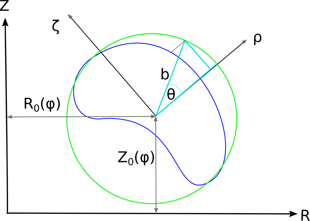 -direction of the plasma boundary (blue). The poloidal angle is chosen to be equal to the polar angle of the horizontal projection of each boundary point on this circle.