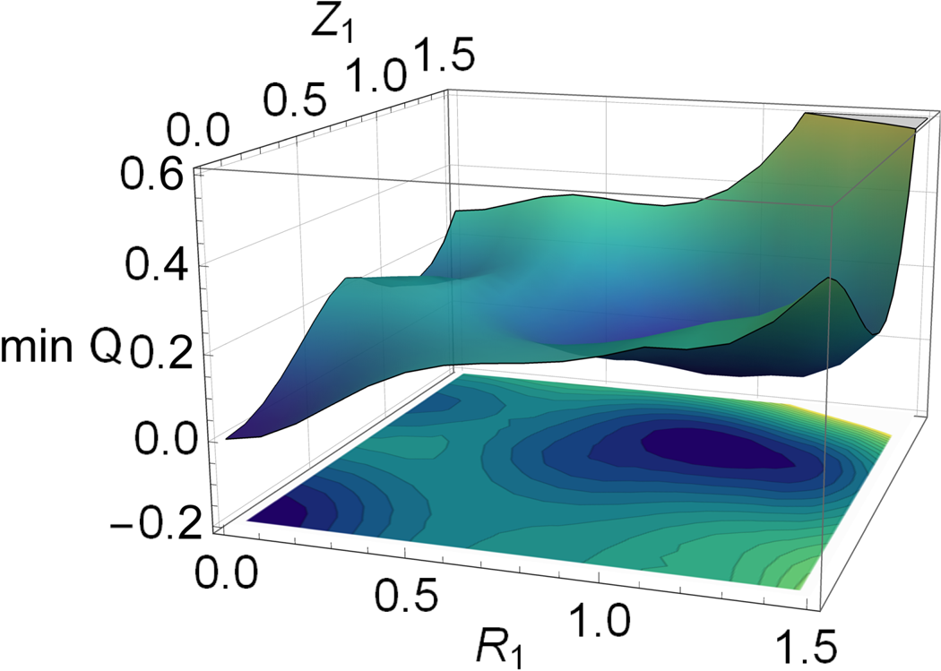 ). Local minimum (grey): $R_1=0.0, R_2\approx 1.05, Z_1=1.15$
