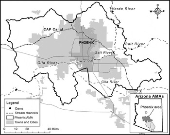 Unsustainable groundwater use—that is, taking more water from an aquifer than is returned annually—is called overdraft or groundwater mining. It is a critical problem in China, India, and many parts of the United States, from California’s agricultural valleys to the humid Florida peninsula. Yet the size of central Arizona’s urban population, its record-setting growth rate (among the highest in the nation), extremely low rainfall (seven inches annually), and the speed at which the state’s groundwater supplies have been depleted merit critical analysis, particularly in light of the mixed results of state efforts to resolve the problem.Footnote 10