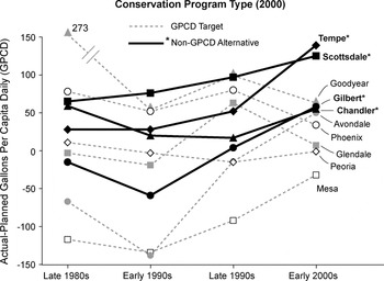 While the two programs are legally “equivalent,” the Arizona Republic acknowledged that the alternative program was virtually a loophole for providers wishing to avoid regulation under the GPCD program. Discussing the fourth city (Gilbert) to join the program, the newspaper reported that the suburban community’s average water consumption in 2000 was 220 GPCD.Footnote 96 With a mandated target of 184 GPCD, the rationale for joining the program was “to get state regulators off their backs.”Footnote 97 The benefits of the alternative program, including license to violate the GPCD target, outweighed the administrative and financial burden of adopting the RCMs.Footnote 98 While ADWR gave the impression that water savings in both of the programs would be equivalent, the town’s logic in joining the NPCCP demonstrates that the two programs were in fact quite different.