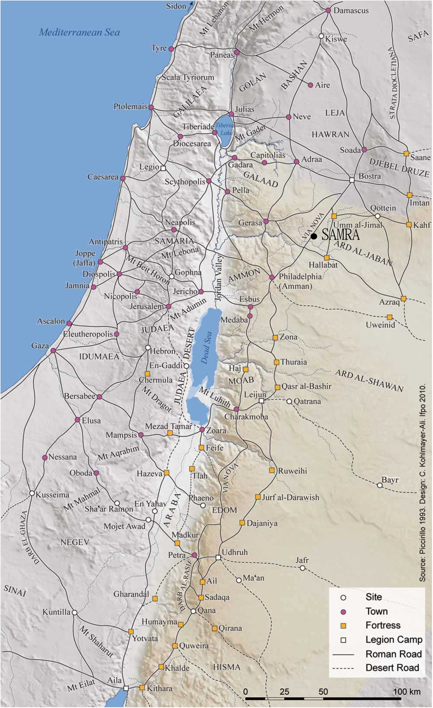 The archaeological project at Samra in Jordan discovered such a road station during excavations of a mound close to the ancient Roman-Byzantine village of Samra and adjoining the Via Nova Traiana (Fig. 1).Footnote 3 Notably, this route represents the most widely attested feature of the Roman annexation of the Nabataean kingdom, which took place in 106 CE and led to the creation of the Province of Arabia.Footnote 4 The construction of the road started shortly after this annexation, between 107 and 114 CE, supervised by governor Gaius Claudius Severus and completed under Hadrian. This north–south highway was built to connect the capital of the new province, Bosra, to the port of Ayla (Aqaba) on the Red Sea, a distance of approximately 430 km.