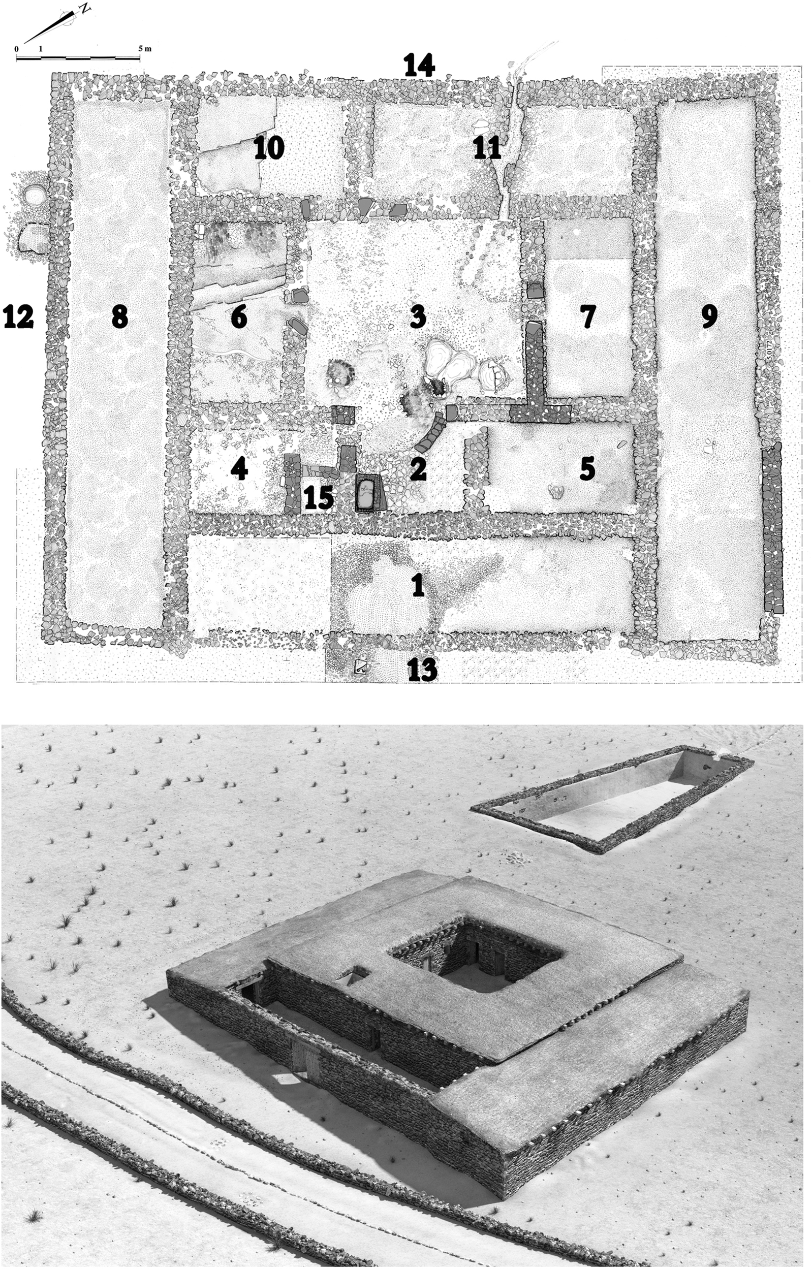 Fig. 3. Top: plan of the road station of Samra (the numbers indicate the room loci); bottom: 3D reconstruction of Samra's mansio. (© L. Monchamps/EBAF.)