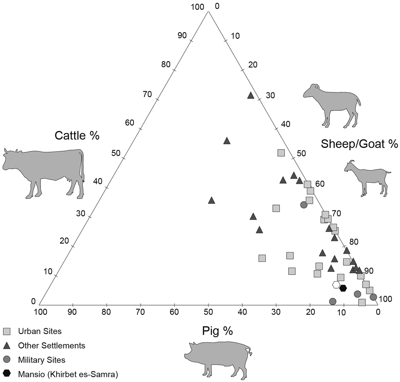 Fig. 4. Tri-plot showing relative frequencies of sheep/goat, cattle, and pig bones from the mansio assemblage and from many assemblages from the Eastern provinces (Syria, Palestine) of Hellenistic and Roman date, arranged by site type. (Drawing by M. Coutureau after King Reference King1999, table J.)