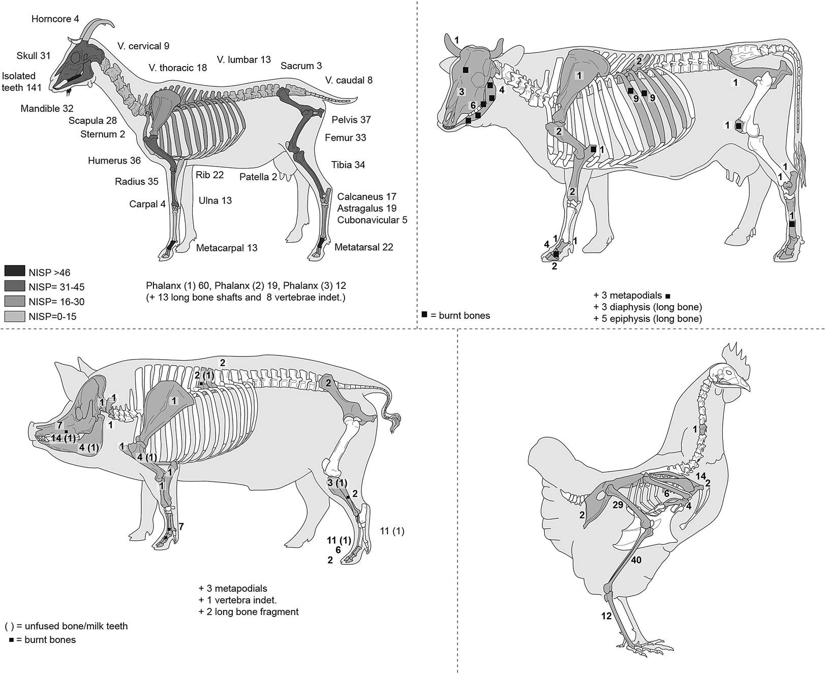 Table 2. Anatomical representation of caprines, cattle, and pigs based on the number of identified specimens (NISP).