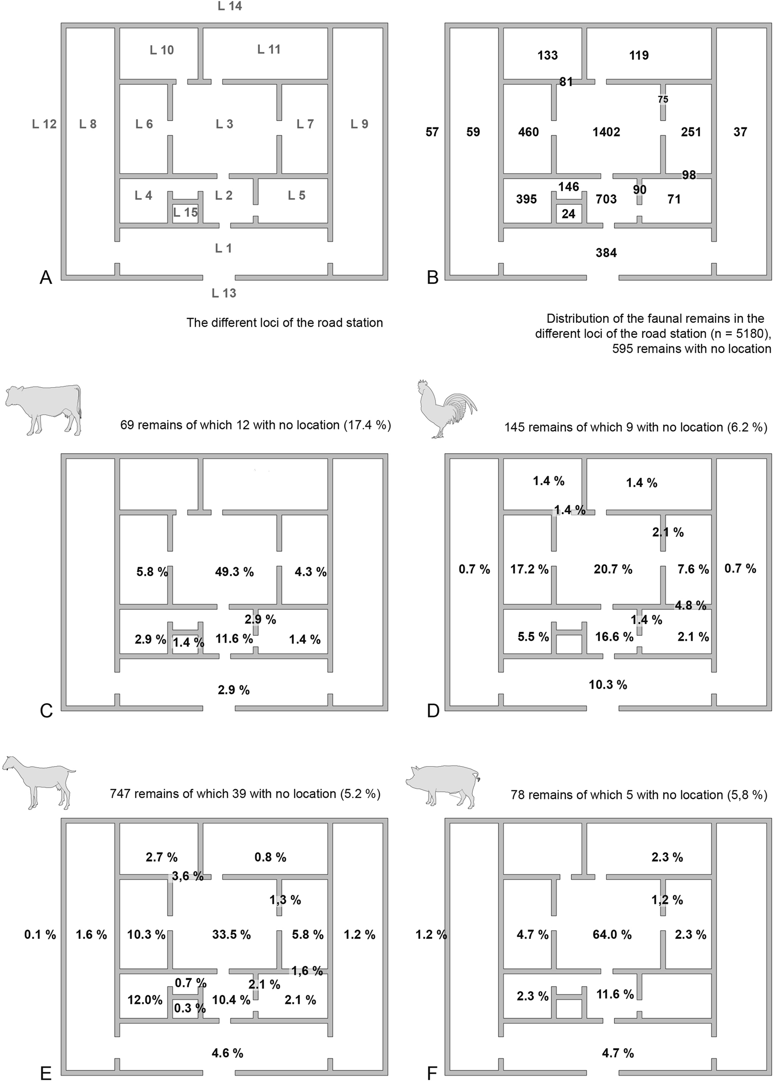 Fig. 6. Spatial distribution of the faunal remains in the different loci of the road station. A: loci numbering; B: distribution of all bone remains; distribution (%) of NISP of cattle (C), chicken (D), caprine (E), and pig (F).