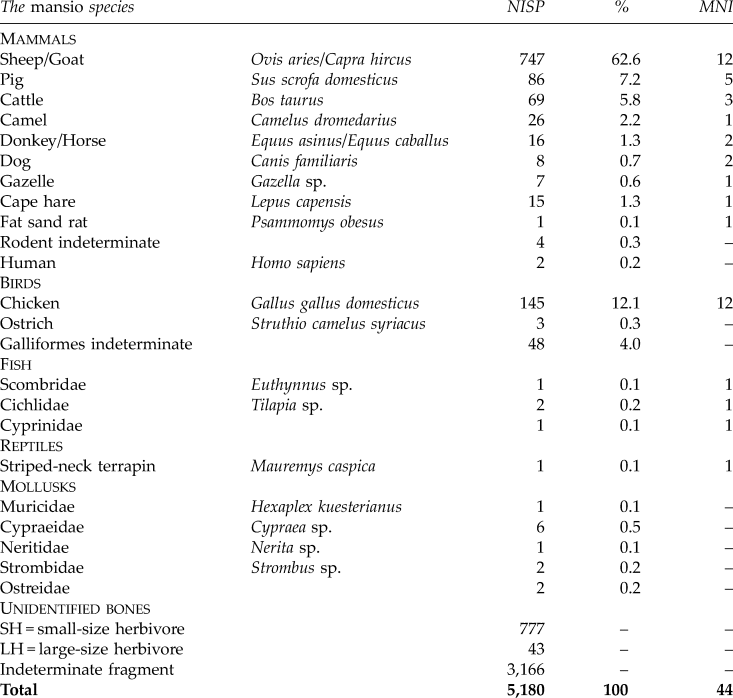 Table 1. The Samra mansio species list given as number of identified specimens (NISP), frequency of identified specimens (%), and minimum number of individuals (MNI). (Two human teeth were also identified.)