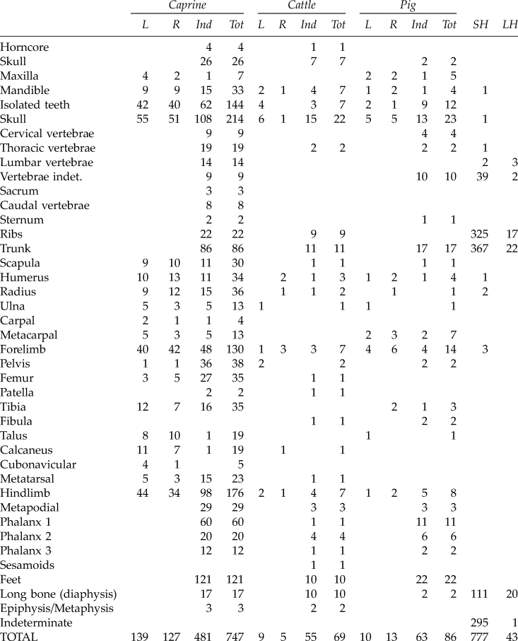 SH = small-size herbivore; LH = large-size herbivore; L = left; R = right; Ind = indeterminate; Tot = total