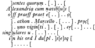 On the fourth line J. F. Gilliam the editor comments: ‘Following -athon it appears that o was first written and then corrected to i. Possibly these letters are part of a name, perhaps the nomen of Marcellus. Mathoni would be possible, though surprising.’