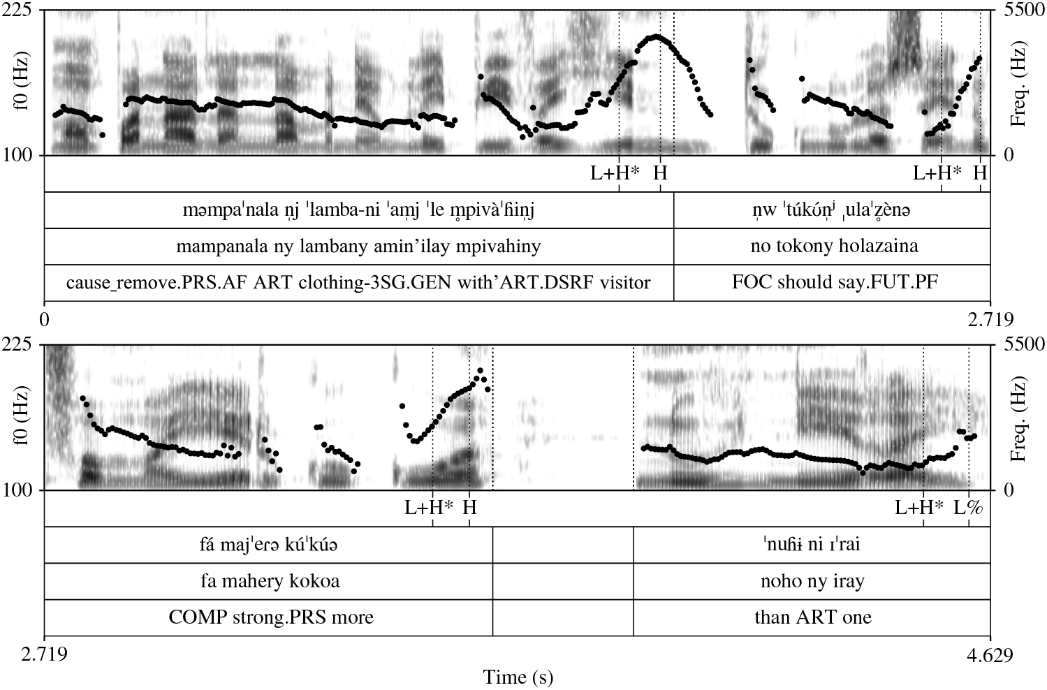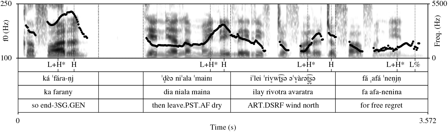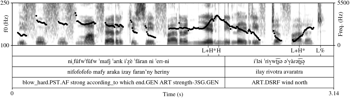 Figure 9 presents an example of a predicate–subject intonation group with two pitch accents aligned with these two syntactic constituents from section (v) of the transcribed passage. High f0 near the beginning is due to high lexical tone (not marked in the figure); f0 then falls for the low lexical tone on izay and jumps up again for high tone on faran’ny. The first rising pitch accent occurs on the first syllable of heriny; overall maximum f0 occurs on the second syllable; and the intermediate phrase ends with a H phrase accent marking continuation. The second rising pitch accent occurs on avaratra, in which the stressed syllable has low lexical tone; a local maximum f0 occurs on the following syllable, but the expected L% fall is not observed. The inflection point in the f0 contour, however, indicates that f0 begins moving towards the low target for L%; that it does not finally arrive at this target can be attributed to the devoicing of the final vowel.