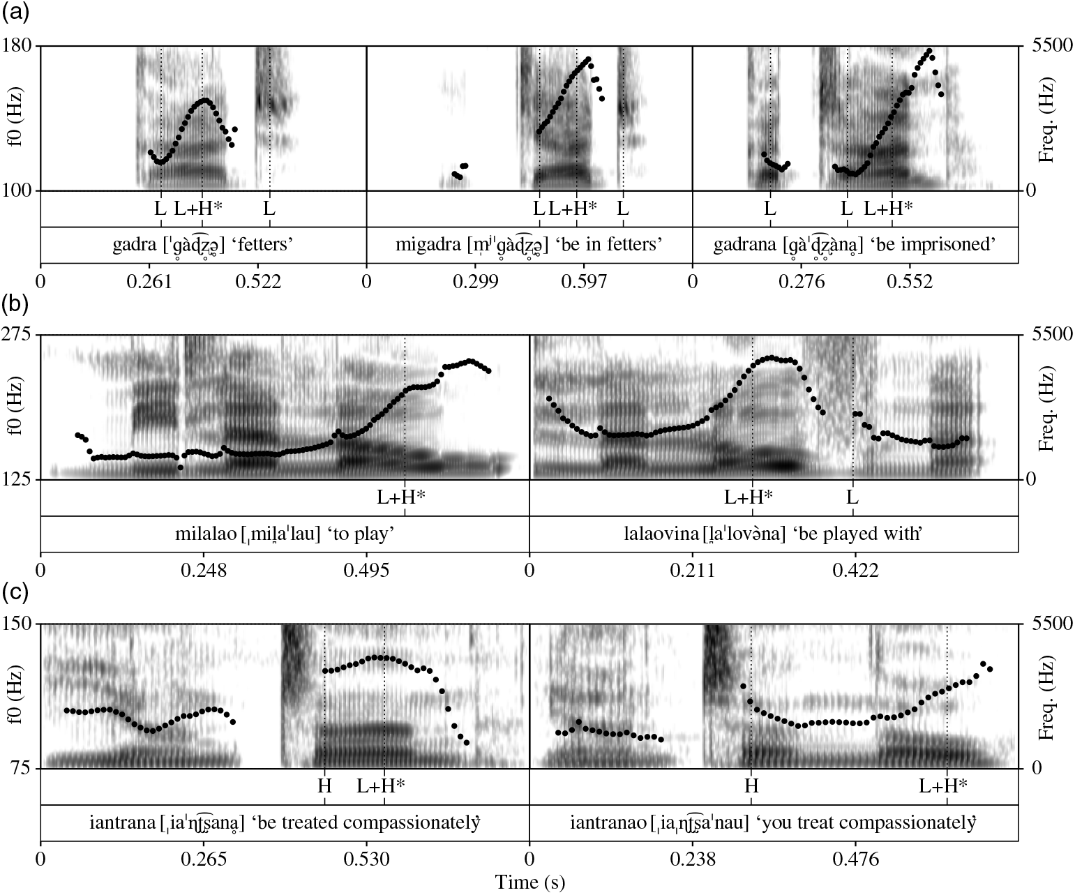Prefixation does not alter the location of primary stress, but suffixation often causes a shift to the right, as in gadra /ˈɡaɖ͡ʐa/ [ˈɡàɖ̥͡ʐ̥ə] ‘fetters’, migadra ‘be in fetters’, /mi-ˈɡaɖ͡ʐa/ [m̩iʲˈɡ̥àɖ̥͡ʐ̥ə] gadrana /ˈɡaɖ͡ʐa-ana/ [ˈɡàɖ̥͡ʐ̥ànḁ] ‘be imprisoned’ (speaker WR, last example repeated from ‘Intonation’ section). Stress shift does not occur in disyllabic roots ending in a weak final syllable (e.g. mifona /mi-ˈfuna/ [miˈfuna] ‘(af, prs)-beg.pardon’ > ifonana /i-ˈfun-ana/[iˈfunana] ‘(prs, cf)-beg.pardon-(cf)’, Adelaar Reference Adelaar2012: 138, no recordings available) or when root stress is on the final syllable, as in the examples presented earlier in the text: milalao [ˌmil̪aˈlau] ‘to play’ vs. lalaovina [l̪aˈlovə̀na] ‘be played with’.Footnote 8 Figure 12 illustrates by means of the location of pitch accent the stress shift that occurs in gadrana but not in lalaovina. Adelaar (Reference Adelaar2012) offers a concise summary of the surface pattern, stating that in suffixed forms, primary stress appears on the syllable immediately before the suffix.Footnote 9