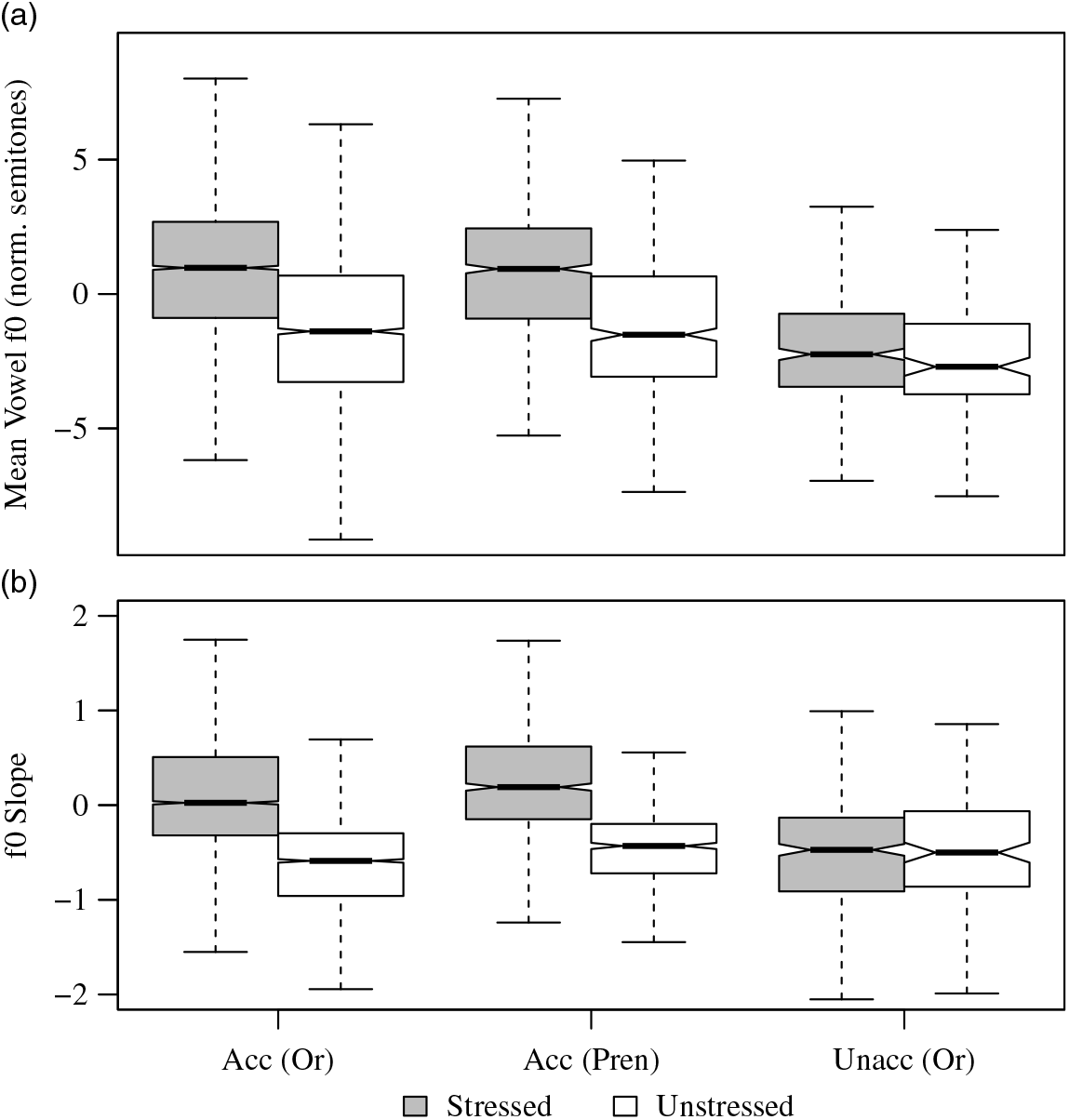 Figure 13 Box plot of (a) mean vowel f0 and (b) f0 slope for stressed and unstressed syllables in three syllable types: with oral obstruent onsets in lexical items bearing pitch accent, with prenasalized obstruent onsets in lexical items bearing pitch accent, and with oral obstruent onsets in lexical items not bearing pitch accent. In the latter case, neither cue is significant.