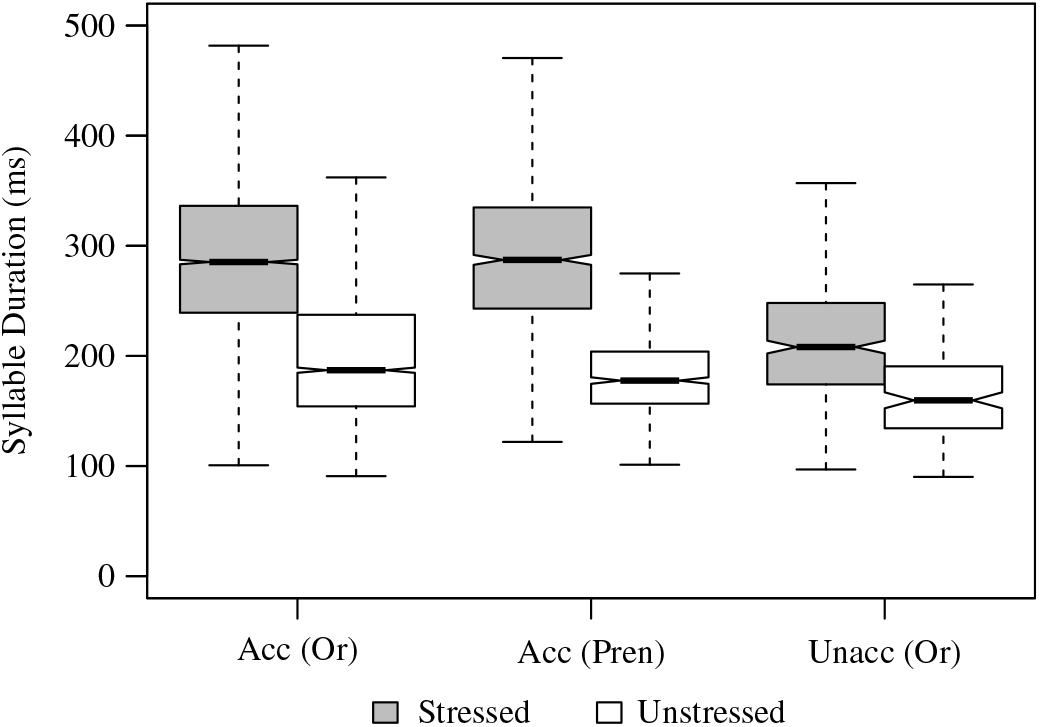 Figure 14 Box plot of syllable duration for stressed and unstressed syllables in three syllable types: with oral obstruent onsets in lexical items bearing pitch accent, with prenasalized obstruent onsets in lexical items bearing pitch accent, and with oral obstruent onsets in lexical items not bearing pitch accent. Duration is significant in all three cases.