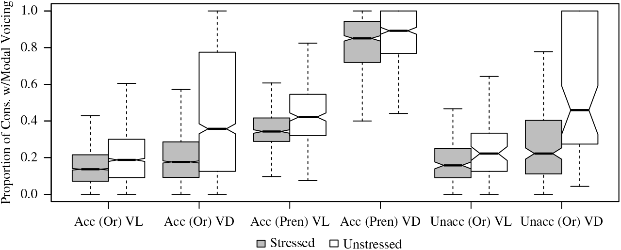 Figure 15 Box plot of proportion of consonant realized with modal voicing for stressed and unstressed syllables in three syllable types: with oral obstruent onsets in lexical items bearing pitch accent, with prenasalized obstruent onsets in lexical items bearing pitch accent, and with oral obstruent onsets in lexical items not bearing pitch accent. Tokens are further divided according to phonological voicing class of the onset consonant. In all syllable types, the tendency is for increased modal voicing in unstressed syllables, although this is only statistically significant for the Acc (Or) syllable type.