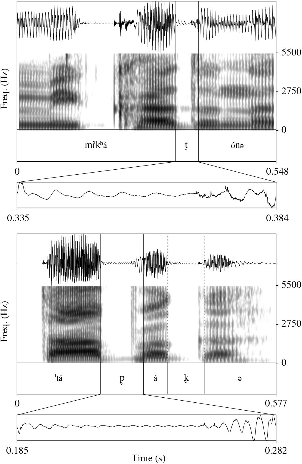 Figure 3 Spectrograms and waveforms of mikatona [miˈkʰát̬ʊ́nǝ] ‘be closed’ and tapaka [ˈtáp̬ák̬ə] ‘cut off’, where unstressed phonologically voiceless plosives are phonetically voiced.
