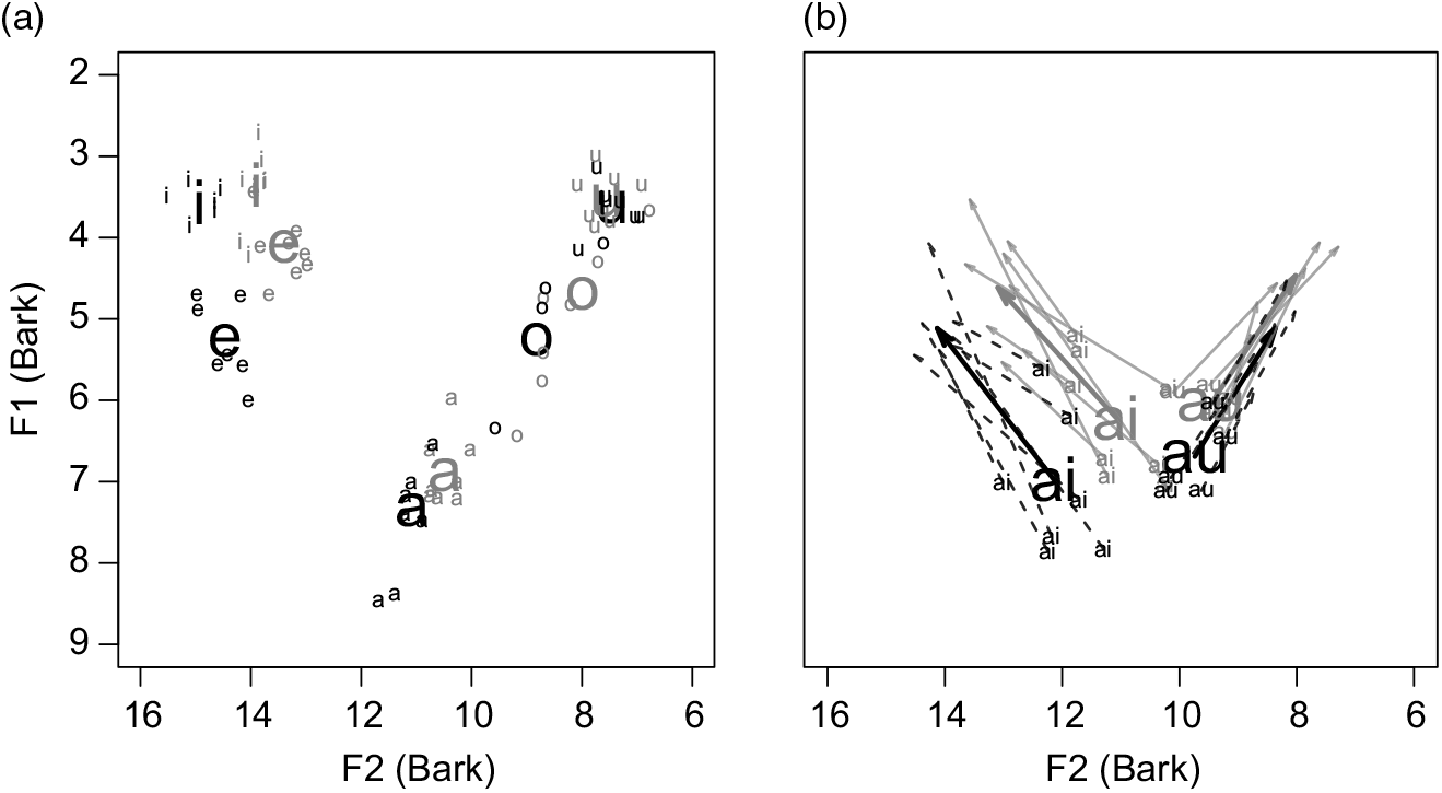 Figure 4 Vowel charts for (a) monophthongs and (b) diphthongs. Group averages (large) and individual speaker averages (small) for seven females (black) and eight males (gray).