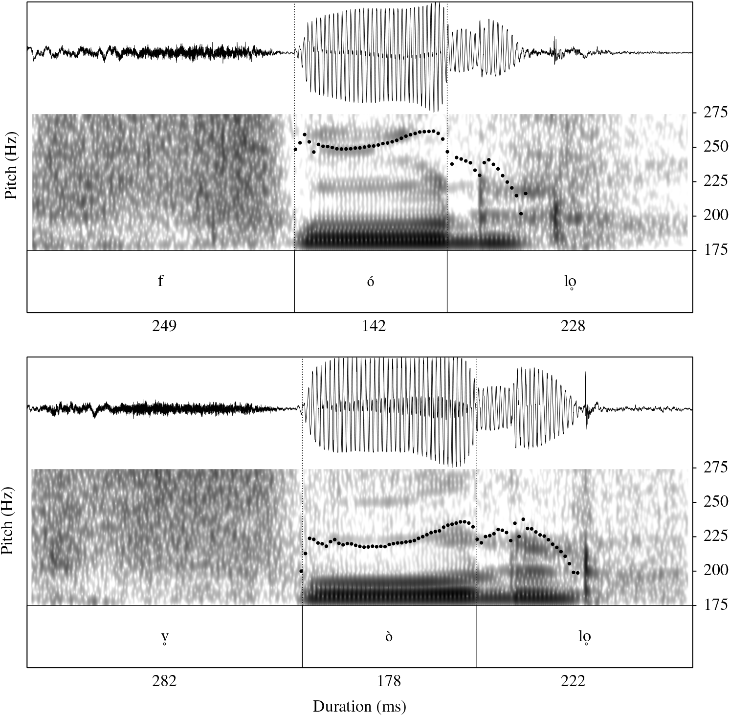 Figure 5 Tone minimal pair folo ‘ten’ – volo ‘hair’ as produced by Merina speaker OHR.