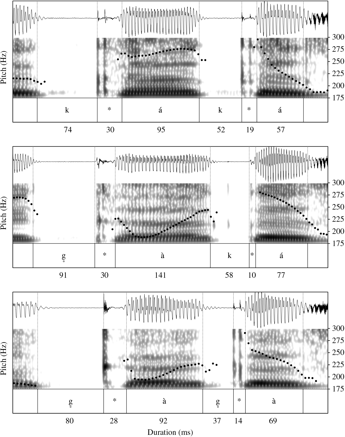 Figure 6 Tone minimal triad kaka ‘a wedge’, gaka ‘quack’, gaga ‘shocked’ produced by Merina speaker AR3. Asterisks in TextGrid mark stop bursts. After Howe (Reference Howe2017: Figure 6.1).