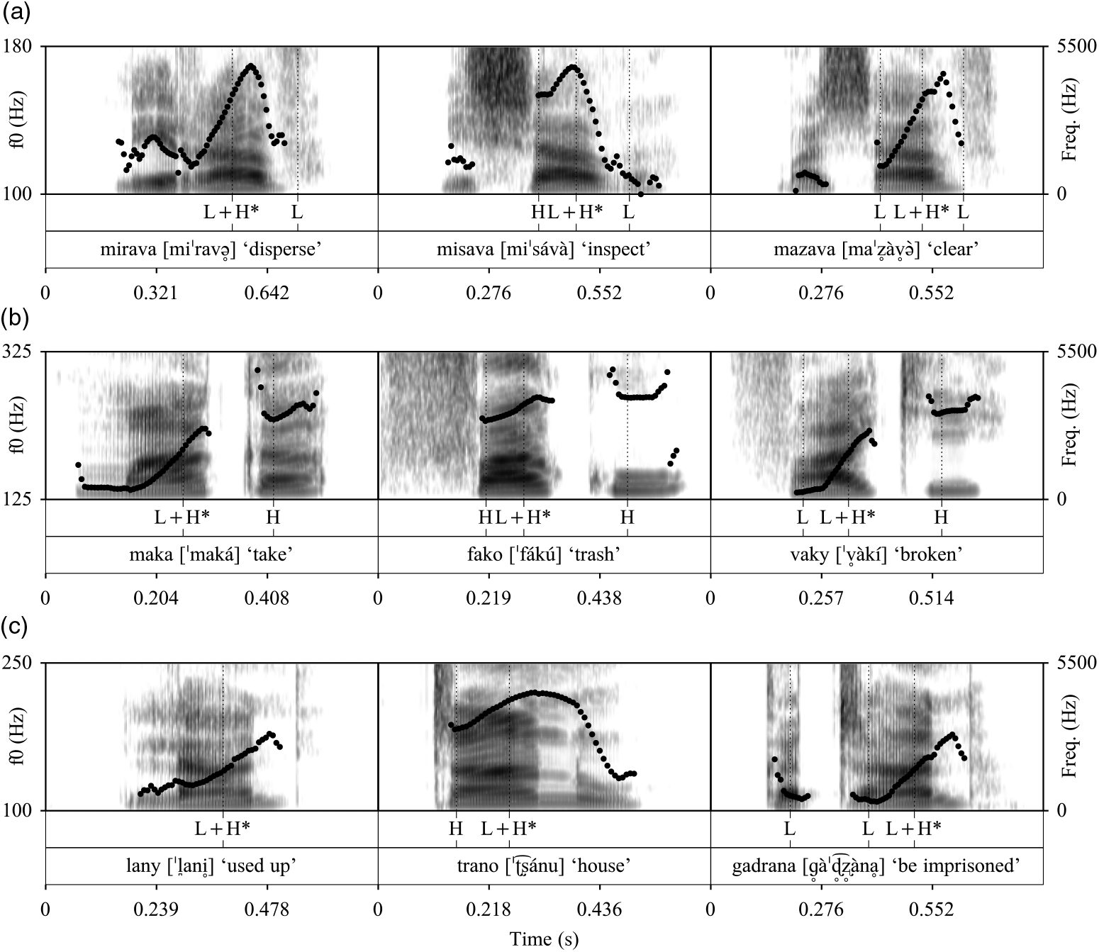 The precise position of the f0 maximum may also depend on the lexical tone of the following syllable. This is illustrated in Figure 8 for examples taken from the ‘Consonants’ section above. In the near-minimal triad mirava ‘disperse’, misava ‘inspect’, mazava ‘clear’, in which the unstressed final syllable in each word carries low lexical tone, maximum f0 over the whole word aligns with the stressed syllable (Figure 8a). However, in the triad maka ‘take’, fako ‘trash’, vaky ‘broken’, in which the unstressed final syllable in each word carries high lexical tone, maximum f0 over the whole word occurs on the final syllable (Figure 8b). In the triad lany ‘used up’, trano ‘house’, gadrana ‘be imprisoned’, in which the final syllables do not carry lexical tone, high f0 also carries over into the final syllable (Figure 8c). It is also worth noting that in the case where the stressed syllable is unmarked for lexical tone (i.e. it is onset-less or has a sonorant onset), the pattern is similar to that in syllables carrying low lexical tone (although the f0 level of the L is slightly less low on average, as seen in Figure 7).