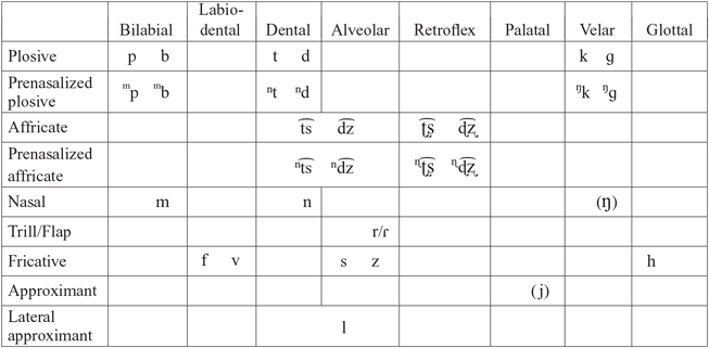 The consonant phonemes of the Central dialects are presented in the table below. Segments which are phonemic only in certain dialects within the Central region are enclosed in parentheses. An example for each segment with associated orthography is given below the table.
