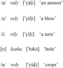 Vowel length distinctions are also not recognized as phonemic. As mentioned in the ‘Consonants’ section above, Andrianasolo (Reference Andrianasolo1993) states that minimal pairs in vowel length arise as a means of maintaining contrast that could be lost due to /h/-elision in dialects such as Merina. However, as demonstrated in the examples above, this lengthening process does not occur consistently, particularly in connected speech.