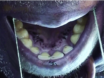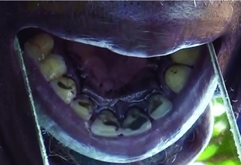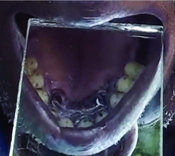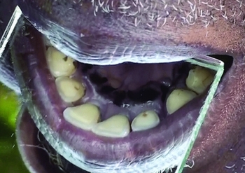 a]. The bulk of the occlusion is against the rear of the upper teeth.