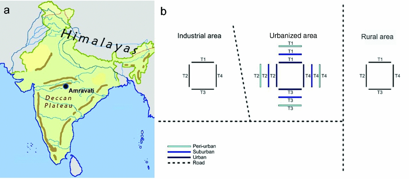The study was conducted in the area of Amravati city (Figure 1), in the state of Maharashtra, on the Deccan Plateau in Central India (20°56′–20°93′N, 77°45′–77°75′E, 343 m asl). This area is characterized by a tropical wet and dry climate with a mean annual temperature of 27°C, and a mean annual precipitation of 874 mm. The summer lasts from March to June, the monsoon season from July to October, and the winter from November to March. An urbanization gradient of five stages was selected on the basis of built-up surface and vegetation composition, as these two parameters are usually considered reliable indicators of human disturbance level (Pickett et al. 2011). The five-stage gradient included (1) rural forest, (2) industrial, (3) peri-urban, (4) suburban and (5) urban area (0%, 0–20%, <35%, 35–50%, >50% of built-up area, respectively, identified from Google Earth). Our selected stages were characterized by similar plant communities, although the dominant species were different. The rural forest was a forest reserve (20°53′N, 77°47′E) classified as Southern Tropical Dry Deciduous Forest by Champion & Seth (Reference CHAMPION and SETH1968), and dominated by Aegle marmelos Correa, Azadiractha indica A.Juss., Butea monosperma Taub., Calotropis procera Aiton, Cassia fistula L. and Gliricidia sepium Kunth. The land between the studied forest reserve and the urbanized area was occupied by rain-fed croplands of mixed cropping. The industrial stage (20°53′N, 77°45′E) was located at the south-eastern part of Amravati city, comprising an area of 200 ha, which was allocated by the government for industrial development. This area was under construction, and changed considerably for the duration of the study. The roads were tarmac, the average size of individual land parcels much bigger than in other areas. Nevertheless, the plant community was represented by the same dominant tree species during our study: Ailanthus excelsa Roxb., Eucalyptus obliqua L'Herit., Leucaena leucocephala de Wit, Psidium guajava L. and Ziziphus mauritiana Lam. The periurban stage (20°53′N, 77°45′E) was located at the periphery of Amravati city, with separate houses, plots of land and streets with little or no asphalt; and less than 35% of the surface was occupied by buildings. Virtually all individual households had gardens and kept domestic animals. The most common plant species were Ficus benghalensis L., Ficus racemosa L., Ficus religiosa L., Lantana camara L., Millettia pinnata Panigrahi and Tamarindus indica L. The suburban stage (20°56′N, 77°46′E) was a residential area dominated by the tree species Delonix regia Raf. and Michelia champaca L. and by the fruit trees Annona squamosa L., and Mangifera indica L. In this area, 35–50% of the total surface was covered with tarmac or occupied by buildings. Several individual households kept domestic animals and cultivated vegetable gardens. The urban stage (20°55′N, 77°45′E) was densely populated, including also the historical centre of the city, and more than 50% of the surface was covered with buildings. It was characterized by tree species of A. indica, Cocos nucifera L., F. religiosa, Polyalthia longifolia Sonn. and Terminalia catappa L. The centre of Amravati was ~6–7 km from the forest area, 4–5 km from the suburban stage, 2–3 km from the peri-urban stage and 4–8 km from the industrial area.