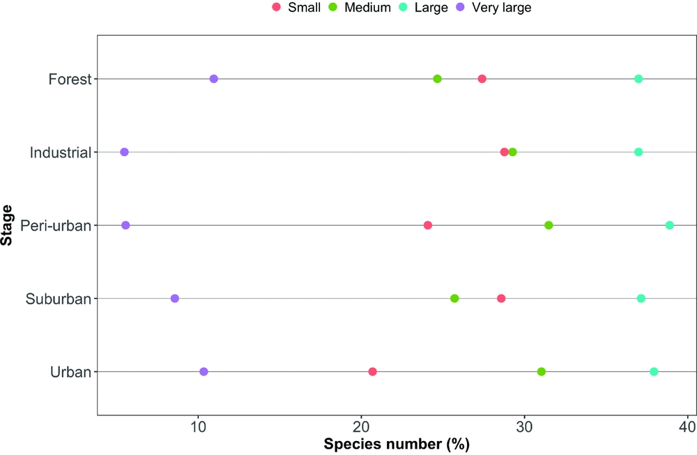 Figure 3. The composition by size classes of the bird assemblages along the five-stage urbanization gradient, observed during censuses in 2010–2013, in and around Amravati city, Maharashtra State, India.