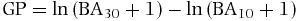 Where BAt and BA, are basal area of all stems at the time of re-census and initial census respectively, and tquadrat is the re-census interval in years for the focal quadrat.