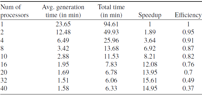 Figure 27 shows the parallel speedup of Sp-GA as a function of the number of CPUs. The speedup increases as the number of processors utilized are increased. Since the training time for 40 CPUs was higher than 32 CPUs, the speedup did not increase. Figure 28 shows the efficiency of the Sp-GA as a function of processors used. The algorithm is only optimal on a single CPU. With the increasing number of processors, the efficiency is decreasing which can be attributed to the additional communication time and CPUs remaining ideal post the fitness calculation.