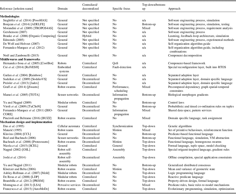 Table 1 Comparison of the properties of reviewed approaches from self-adaptation, self-organization and swarm robotics