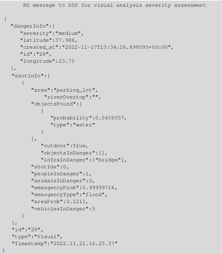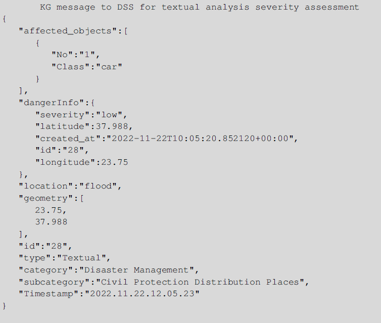 When a Textual Analysis message is generated, the available data are communicated by the KG to the DSS module. Then DSS, after classifying each affected object and taking account of the whole situational picture, generates the predicted SL of the current situation. A message is then sent to the KG using the same format and the same SL classification categories as in the visual analysis.