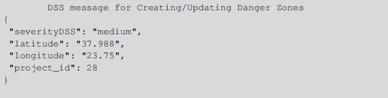 The label severityDSS can take four discrete values which indicate the SL level of a location (‘Low’, ‘Medium’, ‘High’, ‘Very High’). The latitude and longitude indicate the location that the severity score refers to, and the project_id is a unique identifier for the broader area that the location in the messages belongs into. In the first scenario no danger zones exist in the area surrounding the point (i.e., latitude-longitude) that is contained in the message. In this case a new danger zone will be created that will be assigned the severity which is contained in the message. The danger zone is a bounding box which is created based on the latitude and longitude that exist in the DSS message, based on the following function: (latitude - 0.001 longitude - 0.001 latitude + 0.001 longitude + 0.001).
