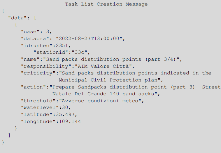 The task creation list is another function which is a result of the communication between the XR4DRAMA framework and the DSS. In this case, the DSS will recommend to the XR4DRAMA framework to attach a set of tasks to POIs, that need to be performed by the first responders for the disaster to be tackled. The use case for this service was based on a flooding scenario, in which external sensors would measure the water level of the river Bacchiglione which passes through Vicenza, and if the water level would overcome a threshold, then the DSS would recommend various tasks that need to be performed on different locations. The location of the sensor as well as the thresholds were placed and defined by the civil protection authorities of the area. Therefore, the task would be attached to POIs for the first responders to see and perform them, to have the best possible outcome in a disaster management scenario.